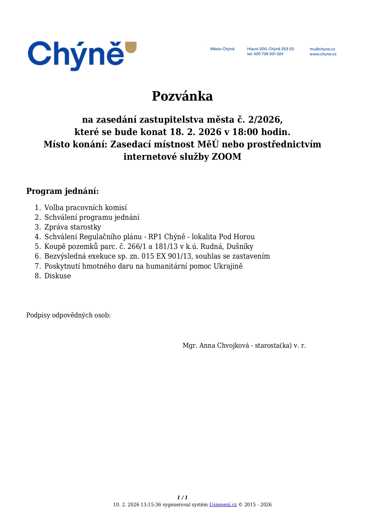 Zasedání Zastupitelstva města Chýně č.2/2026